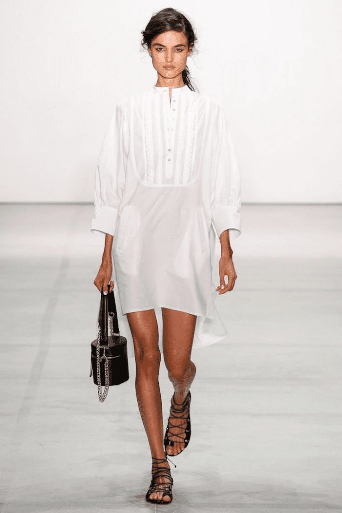 Partiamo dalla mise – rigorosamente bianca – dall’effetto elegante e fresco, da scegliere – preferibilmente – in versione short, ma piacevole anche nella rilettura over, a meno che non si voglia arredare di cintura. Se la lunghezza si spinge fin sotto il ginocchio, le maniche a sbuffo sono pressoché d’obbligo.