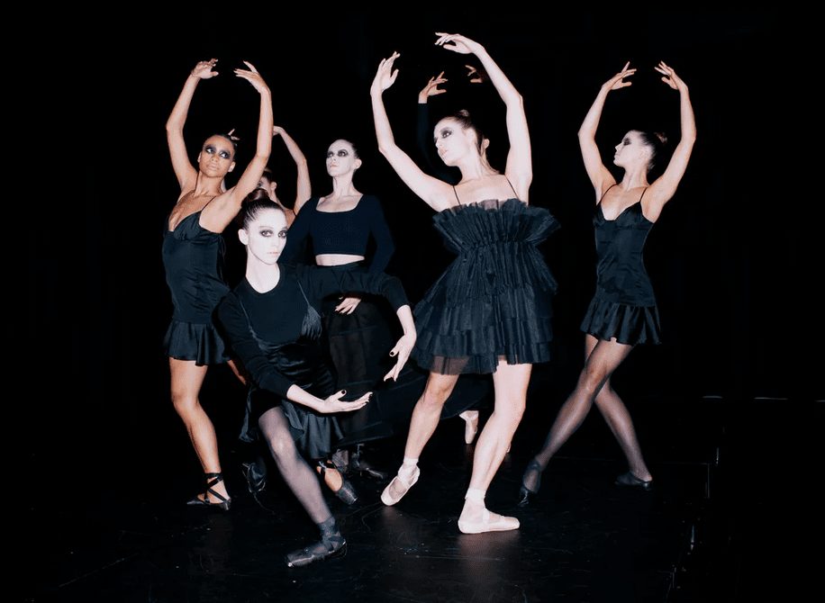 Proprio così. I capi d’abbigliamento, ripescando dall’archivio dei costumi di scena, si lasciano sedurre dal fascino di crop top, tute accademiche, cortissimi abiti in tulle a balze, slip dress, body modellanti e calze, declinandoli in due diverse tonalità, a contrasto.