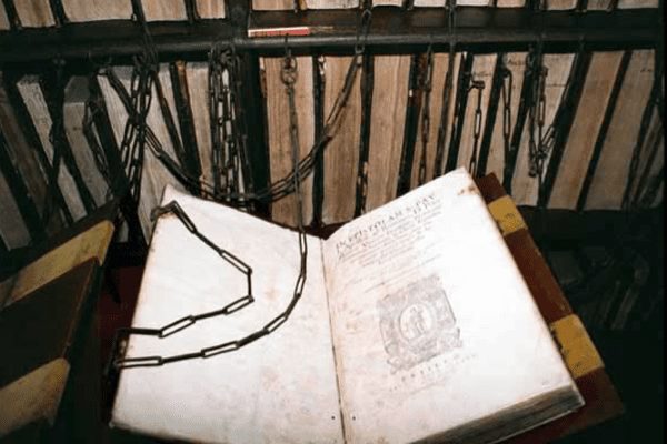Cosa c’è di meglio di una biblioteca, per scartabellare libri interessanti, magari testi storici?Materiale, parte del patrimonio della città? Manoscritti, altrimenti introvabili; reperti unici, a cui fare appello e riferimento? Ebbene, nella contea di Herefordshire, precisamente nella biblioteca teologica della cattedrale di Hereford, la consultazione è libera, certo, ma… c’è un ma. Vale a dire che le pagine scritte, da queste parti, sono tenute… in catene. Bloccate, cioè, da tutta una serie di lucchetti, aste e quant’altro serva ad impedirne la sparizione, anche momentanea. Abitudine, peraltro, consueta già nel periodo medievale, per motivi di sicurezza.